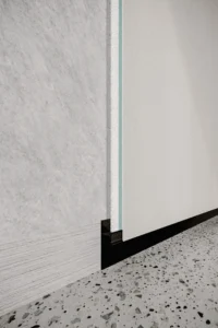 Aliuminis suteikia griežtą, tikslią liniją ir dera prie betono, gipso, mikrocemento, parketo ar vinilinių grindų.